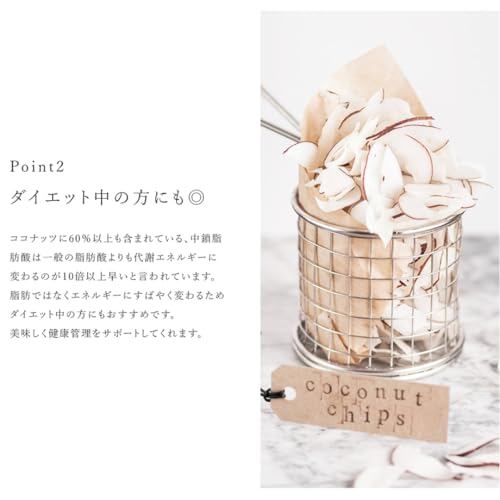 【100%オーガニックココナッツ使用】:農薬を一切使わず、有機栽培されたココナッツを薄切りにしてチップス。薄皮を残したまま低温加工した、美味しさと栄養が詰まっております。