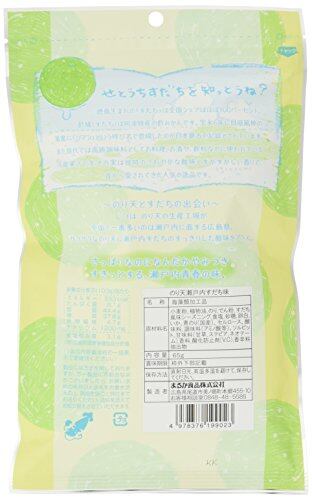 原材料:小麦粉、植物油、のり、でん粉、すだち風味シーズニング、食塩、砂糖、卵白、いか、青のり(国産)、セルロース、酸味料、調味料(アミノ酸等)、ソルビット、甘味料(甘草、ステビア、ネオテーム)、香料、酸化防止剤(V.C)、香辛料抽出物