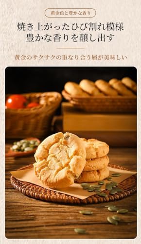 【魅力的な色と香り】黄金色に焼き上げる過程で独特のひび割れ模様ができ、まるで芸術作品のようです。香りが豊かで、バターの芳醇な香りとゴマ、ピーナッツ、カボチャの種の穀物の香りが漂います。黄金色でサクサクした皮は層状になっており、味わいが豊かで、一口ごとに豊かな香りが広がり、いつまでも食べ続けられます。