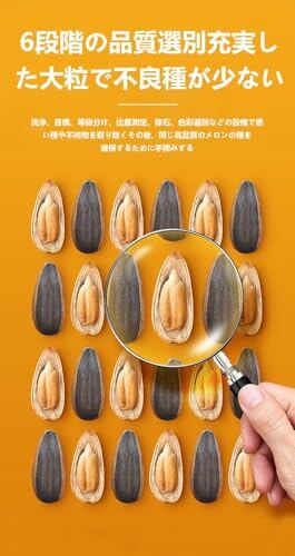 【厳格な原料管理】核心ひまわり園の旬の新メロンの種を原料に選び、太陽の光と雨をたっぷり浴びて、粒の大きさ、ふくよかで、内面が甘いメロンの種です。自社で1万エーカーのひまわり園を持ち、産地から厳しく品質管理することで、メロンの種一粒一粒の高品質と鮮度を確保しています。ひまわり園の日照時間は年間を通じて3000時間を超え、豊富な光がメロンの種に自然の甘みをより蓄積させます。
