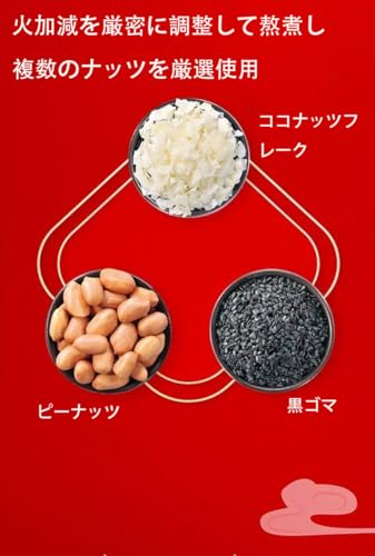 【厳選ナッツ、香りが濃厚】キャンディーの熬煮時には火加減を厳密に管理し、中には多种類の厳選ナッツを精心に配合しています。ココナッツフレークのさわやかな甘い香り、黒ゴマの濃厚な風味、そしてピーナッツの豊かな食感が特徴です。中でもピーナッツは厳格に 9 割れ目まで焼き上げられ、焦げたような濃厚な香りが十分に引き出され、袋を開けた瞬間に香りが四方に広がります。