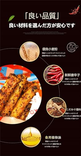原材料と成分:小麦粉、食用植物油、飲料水、食用塩、グリセリン、白砂糖、唐辛子、スパイスなど。