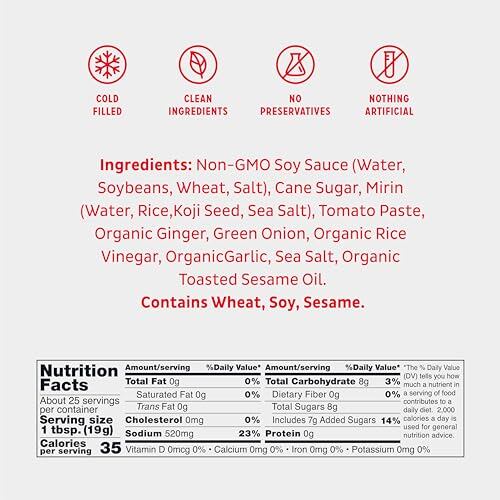 成分:非遺伝子組み換えしょうゆ(水、大豆、小麦、食塩)、サトウキビ、みりん(水、米、麹種子、海塩)、トマトペースト、有機生姜、ねぎ、有機米酢、有機ニンニク、海塩、有機トーストゴマ油 小麦、大豆が含まれています。