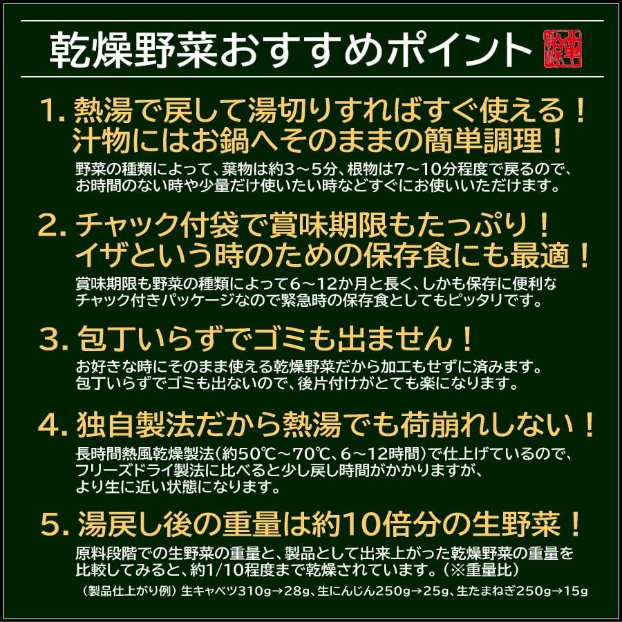 新鮮な野菜を長時間低温乾燥(約50℃~70℃、6時間~12時間)で仕上げます。このため、熱湯で戻した時、生により近い状態になります。フリーズドライと比較すると、戻り方が少し遅いです。