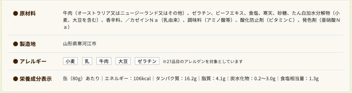 栄養成分表示 缶(80g)あたり|エネルギー:106kcal|タンパク質:16.2g|脂質:2.4~5.4g|炭水化物:0.1~3.6g|食塩相当量:1.3g
