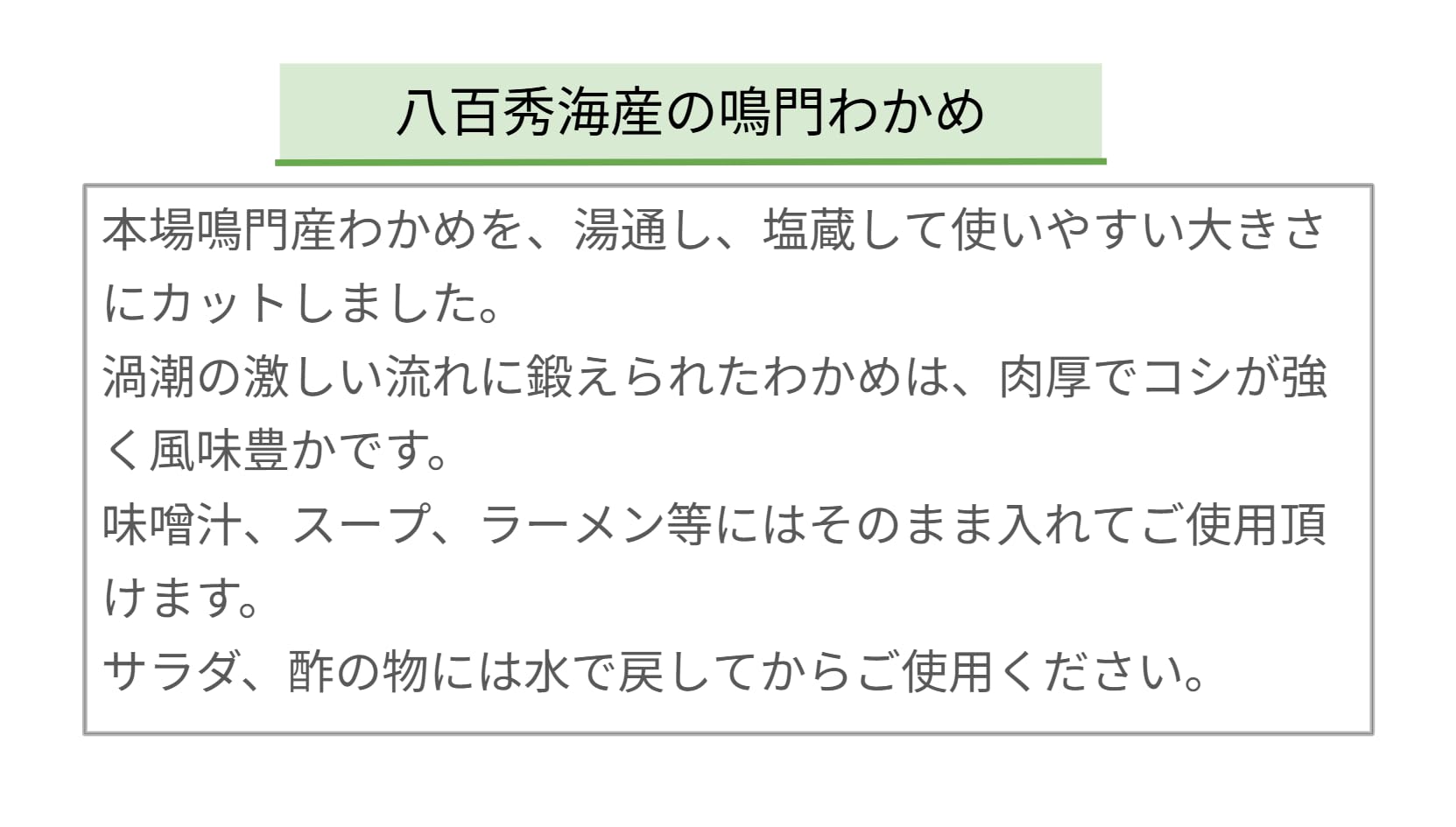 徳島県が加工履歴を管理した安心安全なわかめです。 味噌汁、うどん、そば、ラーメン等水戻しせずにそのままお使い頂け、とても便利です。また、水戻ししてサラダ、酢の物にもお使い頂けます。