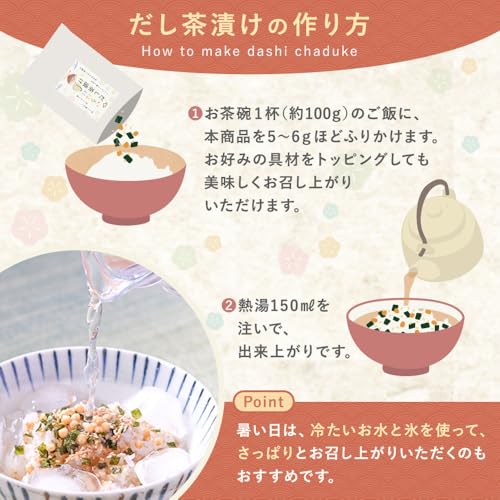 【だし茶漬けの作り方】お茶碗1杯(約100g)のご飯に、本商品を5~6gほどふりかけます。お好みの具材をトッピングしても美味しくお召し上がりいただけます。②熱湯150mlを注いで、出来上がりです。暑い日は、冷たいお水と氷を使って、さっぱりとお召し上がりいただくのもおすすめです。