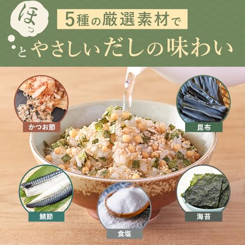 【5種の厳選素材】かつお節、鯖節、昆布、海苔、食塩を使用。やさしいだしの味わいに。アレンジに梅しそや鶏そぼろ、納豆とねぎ、贅沢に鯛を使っただし茶漬けも手軽に。
