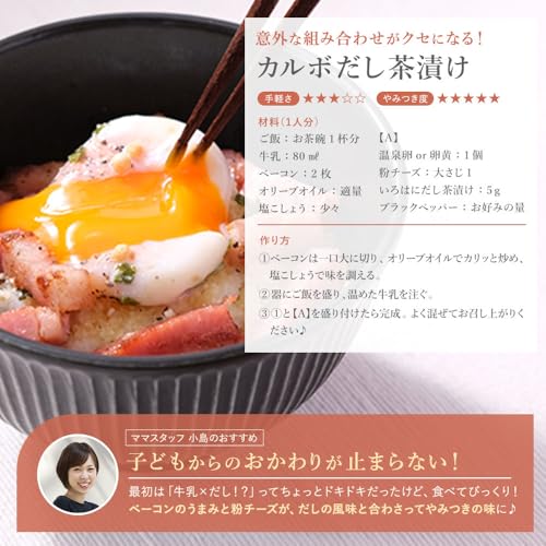 【使いたい分だけ使える】添加物(着色料・酸味料・酸化防止剤・うま味調味料・香料)不使用。いろはにだし茶漬けです。さらっと1杯も、具だくさんのごちそう茶漬けも。いろはにだし茶漬けは、あなたのおいしいに寄り添います。自由な食べ方で、あなたらしい美味しいを。
