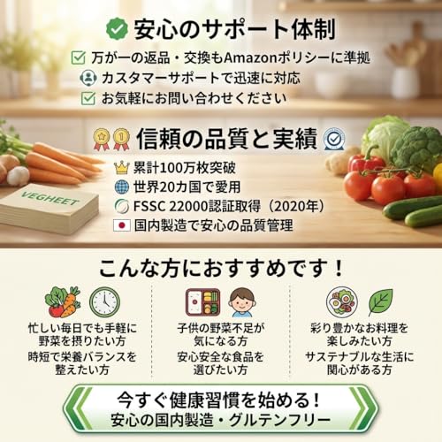 健康的な食生活:VEGHEETミニやさいシートは、ニンジンを主成分とした乾燥野菜シートです。グルテンフリーであるため、健康を意識した食生活をサポートします。野菜不足を感じている方に、手軽に栄養を補給できる選択肢を提供します