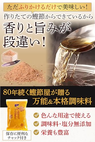 【究極の旨味】80年以上の歴史を持つ老舗の技で製造されたかつお節の削り粉は、伝統のかつお節、鰹節、かつおぶしとして業務用にも最適。粉末状に加工されたカツオ粉は、出汁だけでなく多彩な料理に活かせる万能調味料です。