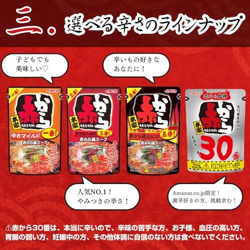 【赤から鍋1番】赤からの店舗で人気の「赤から鍋1番」の味を忠実に再現しました。3番よりも唐辛子の量を控え、甘みとみその量を増やすことで、お子様にも食べやすいマイルドな味に仕上げました。