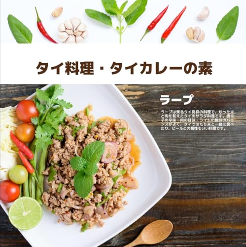 【ラープの素】ラープは、タイの東北部の食文化に欠かせない肉のサラダ料理。炒った米を使うのが特徴ので、一から家庭で作るのはなかなかに手間がかかりますが、ラープの素を使えばその手間いらず。鶏肉を使えば、ラープ・ガイに、豚肉を使えばラープ・ムー、牛肉を使えばラープ・ヌアとアレンジも簡単です。 お好みのひき肉を水で炒めてから、ラープの素を入れてよく混ぜ合わせたら、用意しておいた赤玉ねぎのスライスやパクチー、パセリ、ネギなどの香菜を加えるだけで一品が完成します。辛味と酸味、そして炒った米の香ばしい香りをまとったサラダはもち米と相性抜群です。葉野菜で包んで食べても美味しいので、ぜひ試してみてください。 ラープはタイ料理好きには、米が進むと評判の料理です。手間いらずで簡単に作れるラープの素を活用して、ぜひ自宅でタイの屋台気分を味わってください。