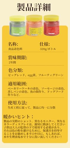【マルチシナリオに適用、3色を手元に】ケーキ、ブリスケット、ベーコンソーセージ、roまんを焼いたり、魚のえさやドッグフードを作ったりと、その応用範囲は極めて広い。また、大きな赤、egg黄、フルーツグリーンの3色から選ぶことができ、さまざまなシーンの色彩ニーズに応えることができる。さらに、用量が省かれ、溶けやすく、食材を均一に着色することができるので、どの食材も自然で鮮やかな色を持つことができます。