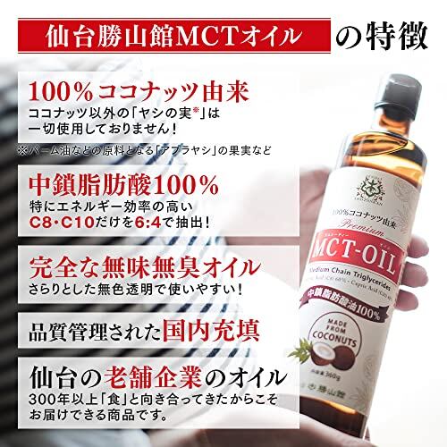 ✅【仙台勝山館mctオイルはココナッツ100%】✅原料は希少なココナッツを100%使用 ココナッツ以外のヤシの実は使用しておりません ✅中鎖脂肪酸100% エネルギー効率の良いC8:C10のみを6:4で抽出しました。✅【300年以上続く食の老舗企業が作る、丁寧なmctオイル】✅化学溶剤を一切つかわない、ナチュラルな蒸留製法で抽出 ✅国際規格ISO9001の工場で丁寧に抽出 ✅ 国内充填され、みなさまの元にお届け