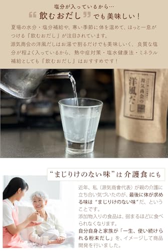 【飲むおだし】夏場の水分・塩分補給や、寒い季節に体を温めて、ほっと一息がつける「飲むおだし」が注目されています。 源気商会の洋風だしはお湯で割るだけで美味しい汁物になります。 良質な塩分が程よく入っているから、熱中症対策・塩水健康法・ミネラル補給としてもおすすめです!!