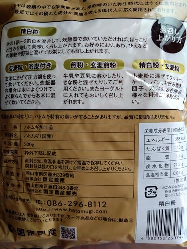 特徴:国産ハトムギを精白して粉砕した、生のハトムギ粉です。チャック付き袋入りで必要な量だけ使えて便利。