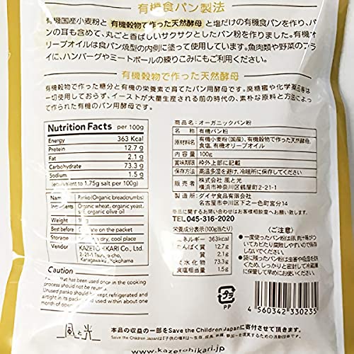 揚げ衣に使うと、サクサクとした食感が楽しめます。天然酵母でつくった有機食パンを丸ごと粉砕乾燥・サクサクとした食感、香ばしく仕上がる。砂糖・添加物不使用